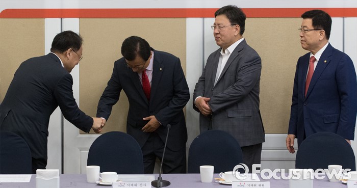 (서울=포커스뉴스) 21일 오전 서울 여의도 국회 귀빈식당에서 열린 2016년 세법개정 당정협의에 참석한 유일호(왼쪽부터) 경제부총리 겸 기획재정부 장관과 이현재 새누리당 의원, 오정근 혁신비대위원, 김광림 정책위의장이 인사하고 있다.