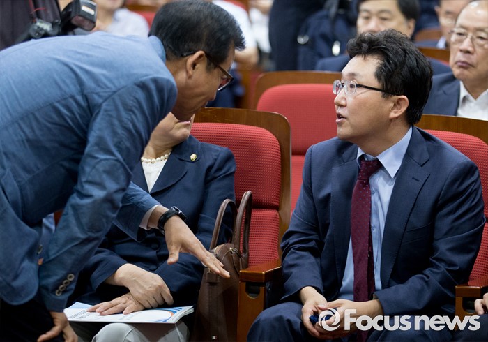 (서울=포커스뉴스) 21일 오전 서울 여의도 국회 의원회관에서 열린 퓨처라이프포럼 2기 출범식 및 세미나에 참석한 김용태(오른쪽) 새누리당 의원과 포럼 공동대표인 원혜영 더불어민주당 의원이 대화하고 있다.