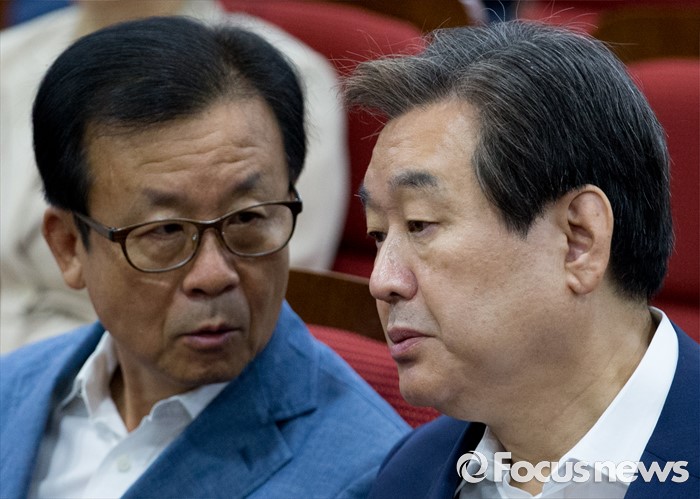 (서울=포커스뉴스) 21일 오전 서울 여의도 국회 의원회관에서 열린 퓨처라이프포럼 2기 출범식 및 세미나에 참석한 김무성(오른쪽) 새누리당 전 대표와 원혜영 더불어민주당 의원이 대화하고 있다.