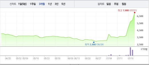 이는 일주일 전 주가인 14일(3600원)과 비교했을 때 94.4% 상승한 수치다.