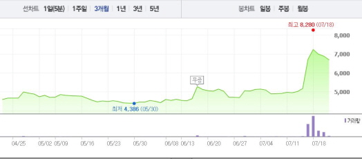 다날은 포켓몬 GO의 온라인 결제사 지분 보유 소식에 주목을 받았다. 포켓몬 GO는 미국, 캐나다, 호주 등에 시범 출시된 상태며 현재 앱 매출 순위에서 최상위권에 올라갔다. 한국에서도 포켓몬 GO 열풍이 불고 있다.주가흐름<사진출처=네이버 캡쳐>
