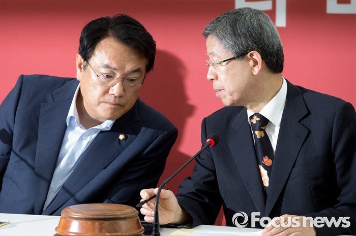 아울러 "북한의 핵과 미사일은 우리 머리 위에 매달려 있는 칼날과 같아서 언제 떨어질지 모른다"며 "이제 사드 논란은 정리돼야 한다"고 덧붙였다.20일 오전 서울 여의도 국회에서 열린 새누리당 혁신비상대책위원회의에 참석한 김희옥(오른쪽) 위원장과 정진석 원내대표가 대화하고 있다. 2016.07.20 박동욱 기자