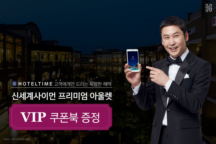 1위 호텔 타임커머스 O2O ‘호텔타임’이 프리미엄 아울렛 ‘신세계사이먼’과 손잡고 VIP 한정판 쿠폰북 증정 행사를 마련했다.'신세계사이먼 VIP 한정판 쿠폰북 무료 증정' 행사를 알리는 포스터.<사진제공=위드이노>