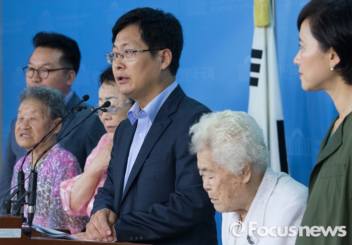 (서울=포커스뉴스) 21일 오전 서울 여의도 국회 정론관에서 유은혜 더불어민주당 의원, 최성 고양시장, 이용수, 박옥선, 이옥선 할머니 등이 위안부 특별법 입법 청원 기자회견을 하고 있다.