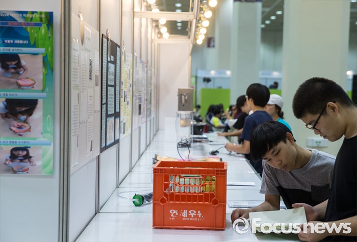 (서울=포커스뉴스) 21일 오전 서울 강남구 코엑스에서 열린 '2016 청소년 발명 페스티벌'에 참여한 학생들이 한 전시품의 작업노트를 살펴보고 있다.