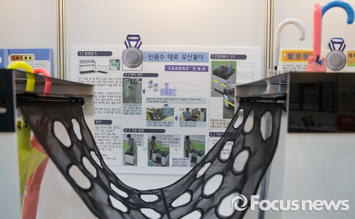 (서울=포커스뉴스) 21일 오전 서울 강남구 코엑스에서 열린 '2016 청소년 발명 페스티벌'에 전시된 우산꽃이.