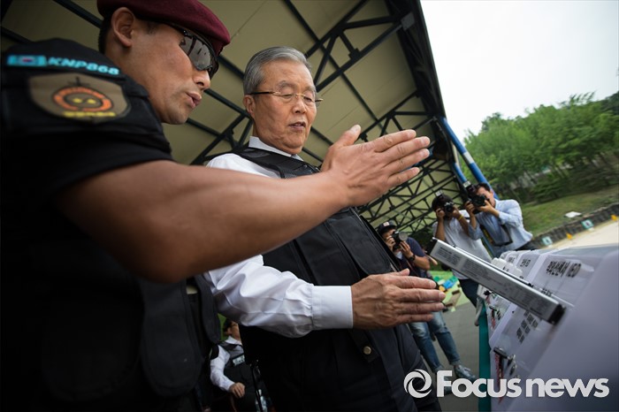 (서울=포커스뉴스) 김종인 더불어민주당 비상대책위원회 대표가 21일 오전 서울 서초구 경찰특공대를 방문해 대테러 훈련 시범을 참관하며 사제 폭발물 폭파 작동을 체험하고 있다.
