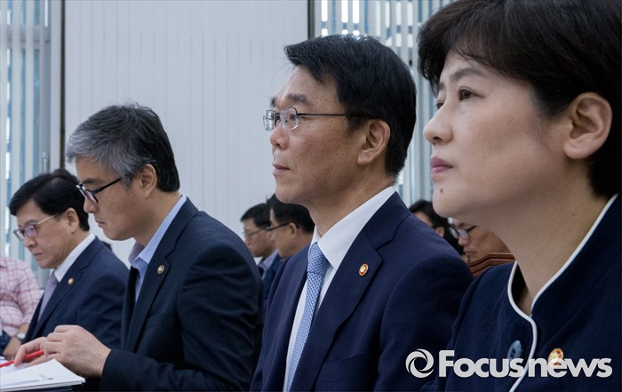 (서울=포커스뉴스) 21일 오전 서울 여의도 국회에서 열린 저출산·고령화대책 특별위원회 전체회의에 참석한 강은희(오른쪽부터) 여성가족부 장관, 강호인 국토교통부 장관, 이영 교육부 차관, 정진엽 보건복지부 장관이 의원들의 발언을 듣고 있다.