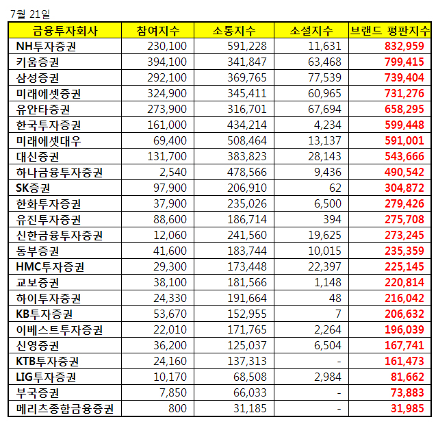 브랜드에 대한 평판지수는 브랜드에 대한 소비자들의 활동 빅데이터를 참여가치, 소통가치, 소셜가치, 시장가치, 재무가치로 나누게 된다. 증권사 브랜드 평판조사에서는 참여지수와 소통지수, 소셜지수로 분석했다.