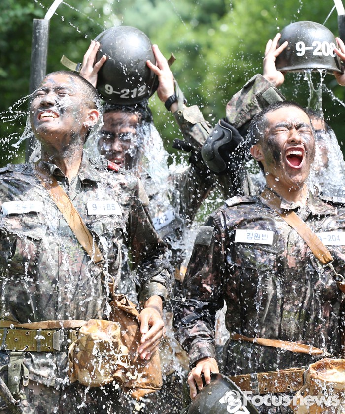 (논산=포커스뉴스) 폭염경보가 발령된 21일 충남 논산 연무읍 육군훈련소 각계전투종합훈련장에서 26교육연대 3교육대 훈련병들이 훈련을 받고 샤워를 하며 더위를 식히고 있다.
