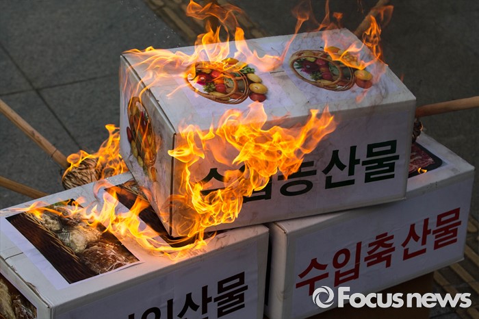(서울=포커스뉴스) 21일 오후 서울 여의도 산업은행 본점 앞에서 농축산물의 김영란법 적용 제외를 요구하는 전국 농축산인 총궐기대회가 열린 가운데 수입농축산물 모형에 불을 붙이는 퍼포먼스가 진행되고 있다.