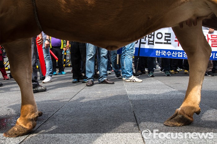 (서울=포커스뉴스) 21일 오후 서울 여의도 산업은행 본점 앞에서 농축산물의 김영란법 적용 제외를 요구하는 전국 농축산인 총궐기대회가 열리고 있다.