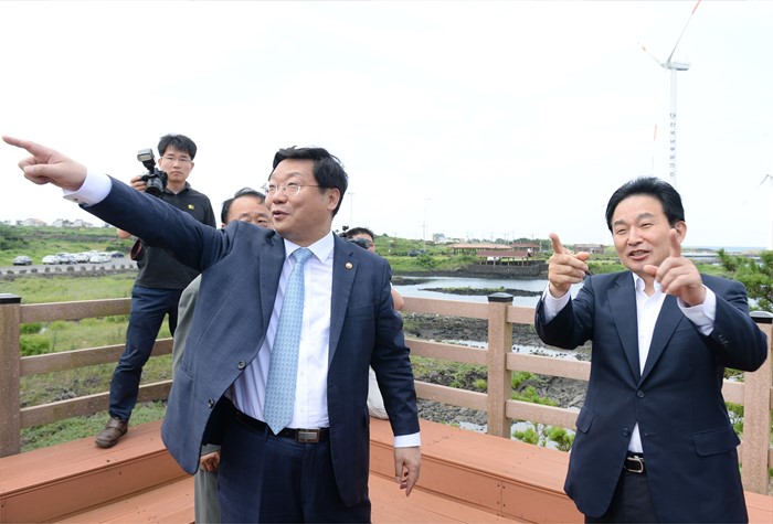 (제주=포커스뉴스) 주형환 산업통상자원부 장관이 21일 제주시 한경면에 한경풍력단지를 방문해 유종근 남부발전사장으로부터 주요현황을 청취한 후 풍력단지 현장을 둘러보고 있다. <사진제공=산업통상자원부>