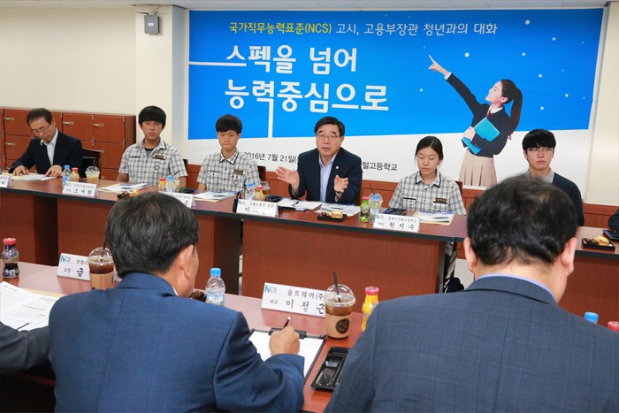 (성남=포커스뉴스) 이기권 고용노동부 장관이 21일 경기 성남시 분당구 양영디지털고를 방문해 학생(재·졸업), 기업, 교사와 NCS에 따른 현장의 변화에 대한 의견을 나누고 있다. <사진제공=고용노동부>