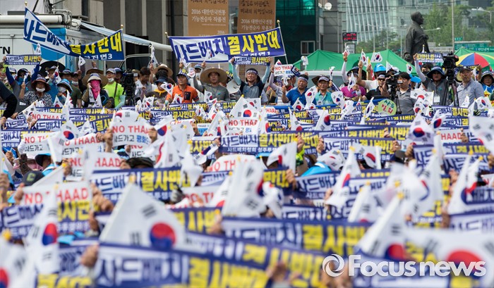 미국의 고고도미사일방어체계 사드(THHAD) 배치에 반대하는 성주 주민 2000여명이 21일 오전 상경해 서울역 광장에서 대규모 집회를 열었다.