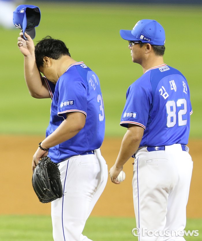 (서울=포커스뉴스) 21일 서울 잠실구장에서 열린 2016 프로야구 삼성-두산 경기 6회말 2사후 삼성 선발투수 김기태가 교체돼 마운드를 내려가고 있다.