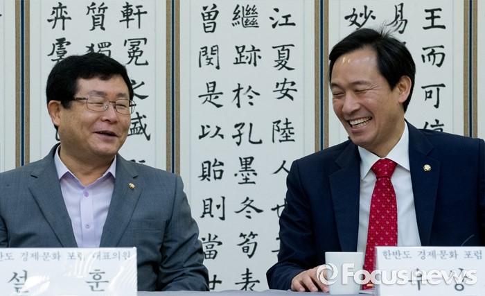 (서울=포커스뉴스) 22일 오전 서울 여의도 국회 귀빈식당에서 열린 한반도 경제·문화포럼 창립총회에 참석한 우상호(오른쪽) 더불어민주당 원내대표와 설훈 의원이 대화하고 있다.