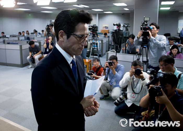 (서울=포커스뉴스) 전당대회 출마를 선언한 정병국 새누리당 의원이 22일 오전 서울 여의도 국회 정론관에서 우병우 청와대 민정수석 사퇴 촉구 및 야당 사드배치 반대 주장 중단 등 현안 관련 기자회견을 마친 뒤 퇴장하고 있다.