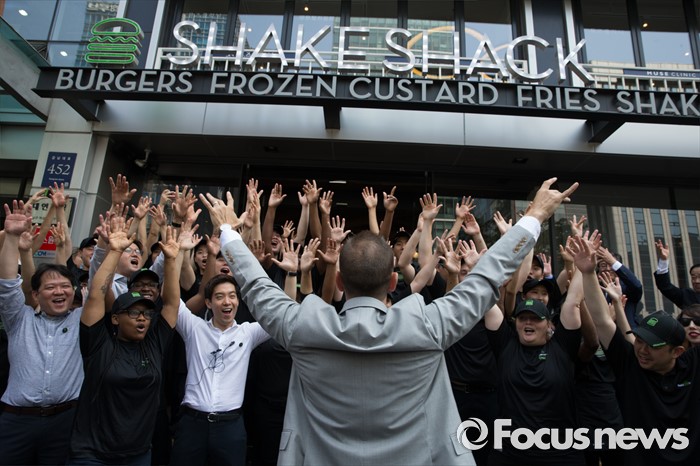 (서울=포커스뉴스) 22일 오전 서울 강남구 쉐이크쉑 국내 1호점 매장 오픈 행사에서 랜디 가루티 쉐이크쉑 CEO와 직원들이 춤을 추고 있다.