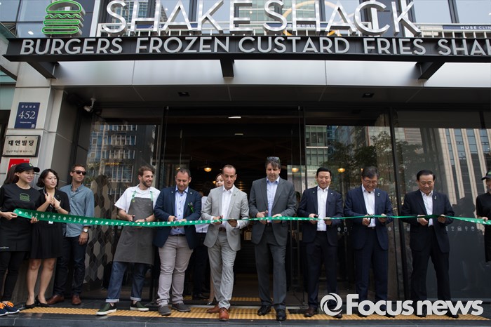 (서울=포커스뉴스) 22일 오전 서울 강남구 쉐이크쉑 국내 1호점 매장 오픈 행사에서 랜디 가루티 쉐이크쉑 CEO를 비롯한 관계자들이 테이프 커팅을 하고 있다. 왼쪽부터 마크 로사티 컬리너리 디렉터, 마이클 콱 글로벌 사업 부장, 랜디 가루티 CEO, 마크 리퍼트 주한 미국 대사, 허희수 SPC그룹 마케팅전략실장, 권인태 파리크라상 대표이사, 황재복 파리크라상 부사장