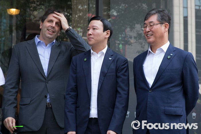 (서울=포커스뉴스) 22일 오전 서울 강남구 쉐이크쉑 국내 1호점 매장 오픈 행사 시작을 내빈들이 기다리고 있다. 왼쪽부터 마크 리퍼트 주한 미국 대사, 허희수 SPC그룹 마케팅전략실장, 권인태 파리크라상 대표이사.