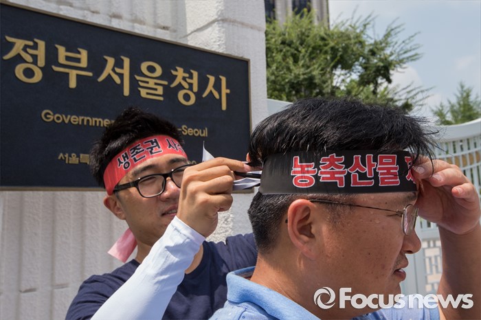 (서울=포커스뉴스) 22일 오후 서울정부청사 앞에서 열린 과잉규제 철폐촉구 농수축산인 기자회견에 참석한 한국농축산연합회 회원들이 머리띠를 두르고 있다.