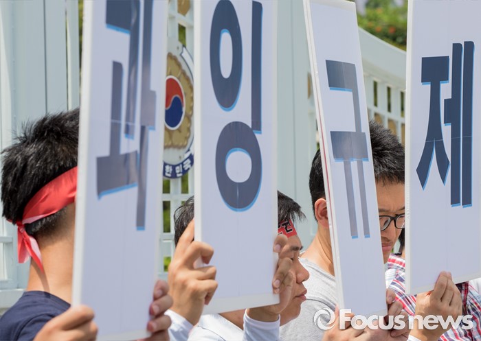 (서울=포커스뉴스) 22일 오후 서울정부청사 앞에서 열린 과잉규제 철폐촉구 농수축산인 기자회견에 참석한 한국농축산연합회 회원들이 김영란법을 반대하는 손팻말을 들고 있다.