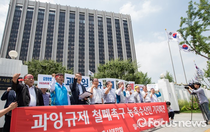 (서울=포커스뉴스) 22일 오후 서울정부청사 앞에서 열린 과잉규제 철폐촉구 농수축산인 기자회견에 참석한 한국농축산연합회 회원들이 김영란법을 반대하는 구호를 외치고 있다.