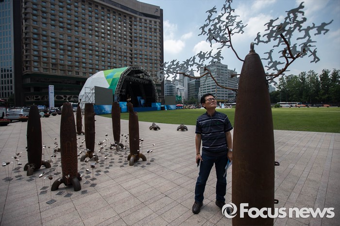 (서울=포커스뉴스) 22일 오후 서울 중구 서울광장에서 '전쟁 없는 세상을 위한 에이이브이(Art's Eye View) 프로젝트 전시가 열리고 있다. 미공군의 사격장으로 쓰였던 경기도 매향리에서 반출된 포탄 및 탄피를 활용, 1000여점의 예술작품으로 만든 이번 전시는 오는 24일까지 열릴 예정이다.