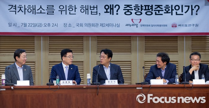 (서울=포커스뉴스) 22일 오후 서울 여의도 국회 의원회관에서 열린 '격차해소를 위한 해법, 왜 중향평준화인가?' 세미나에 참석한 김종석(왼쪽부터) 여의도연구원장, 김광림 새누리당 정책위의장, 정진석 원내대표, 이학재 정책위 일자리특위 위원장, 김태기 단국대 교수가 대화하고 있다.