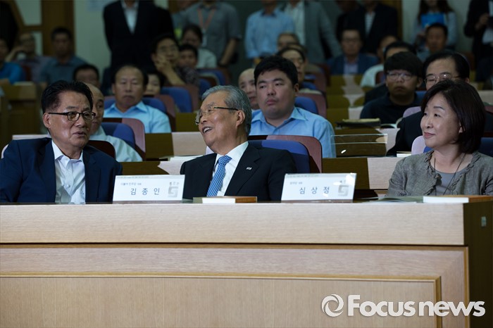 (서울=포커스뉴스) 김종인(가운데) 더불어민주당 비상대책위 대표와 박지원(왼쪽) 국민의당 비상대책위원장이 22일 오후 서울 여의도 국회의원회관에서 열린 '5.18 왜곡 방지와 관련 법안 개정(처별규정) 위한 국민 토론회'에 참석해 대화 하고 있다.