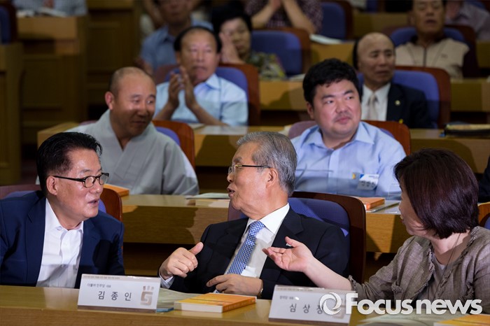 (서울=포커스뉴스) 야3당 대표가 22일 오후 서울 여의도 국회의원회관에서 열린 '5.18 왜곡 방지와 관련 법안 개정(처별규정) 위한 국민 토론회'에 참석해 대화 하고 있다. 왼쪽부터 박지원 국민의당 비상대책위원장, 김종인 더불어민주당 비상대책위 대표, 심상정 정의당 상임대표.