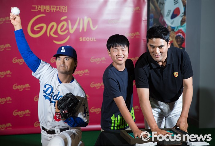 (서울=포커스뉴스) 22일 오후 서울 중구 그레뱅 뮤지엄에서 열린 '그레뱅 뮤지엄 개관 1주년 특별 강연'에 참석한 전 야구선수 박찬호(오른쪽) 한 어린이와 핸드프린팅을 하고 있다.