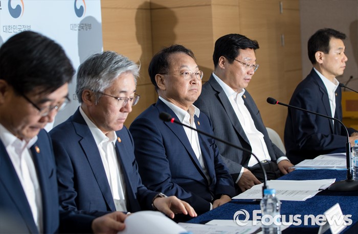 (서울=포커스뉴스) 22일 오후 서울정부청사에서 열린 2016년 추경예산안 합동브리핑에 참석한 유일호(가운데) 경제부총리 겸 기획재정부 장관을 비롯한 장관들이 취재진의 질문을 듣고 있다. 왼쪽부터 이기권 고용노동부 장관, 김종덕 문화체육관광부 장관, 부총리, 주형환 산업통상자원부 장관,정은보 금융위원회 부위원장.