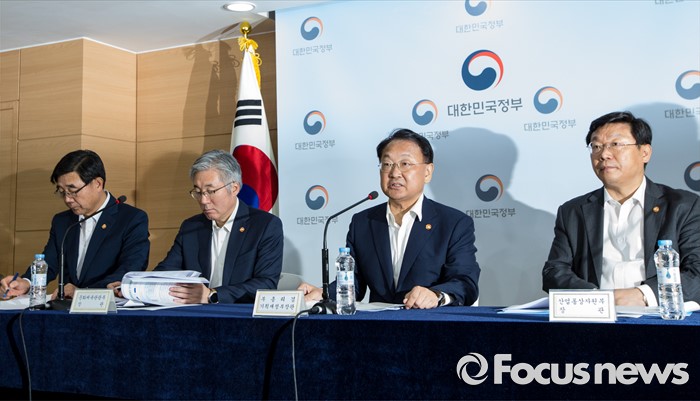 (서울=포커스뉴스) 22일 오후 서울정부청사에서 열린 2016년 추경예산안 합동브리핑에 참석한 유일호(왼쪽 세번째) 경제부총리 겸 기획재정부 장관이 올해 추경예산 규모를 밝히고 있다. 왼쪽부터 이기권 고용노동부 장관, 김종덕 문화체육관광부 장관, 부총리, 주형환 산업통상자원부 장관.