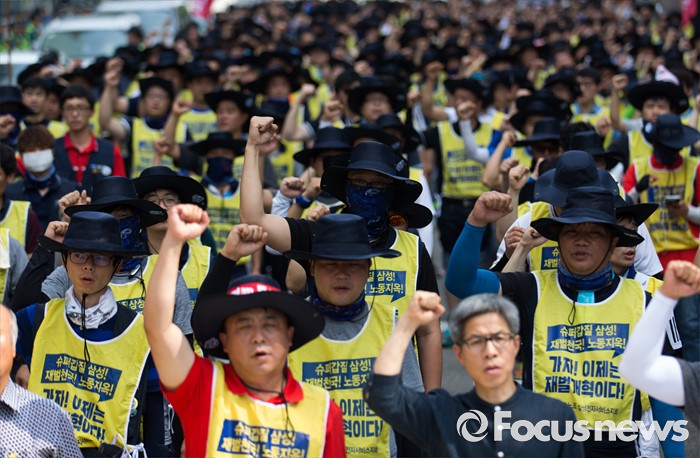 (서울=포커스뉴스) 금속노조 삼성전자서비스지회 조합원들이 22일 오후 서울 서초구 삼성 서초사옥 앞에서 열린 '재벌개혁 투쟁 결의대회'에 참석해 삼성가 3대 세습을 비판하는 구호를 외치고 있다.