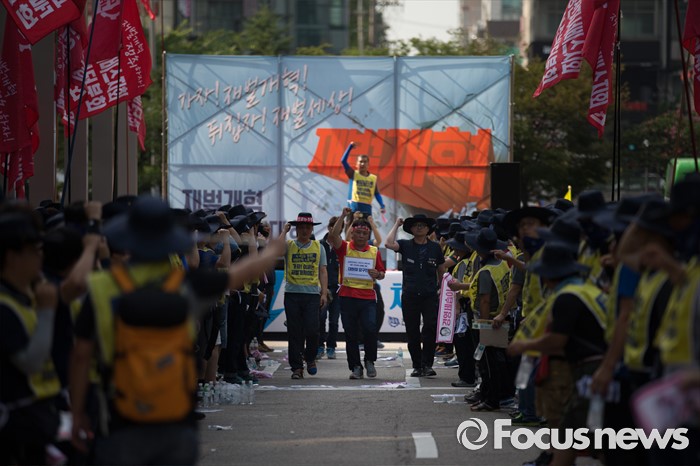 (서울=포커스뉴스) 금속노조 삼성전자서비스지회 조합원들이 22일 오후 서울 서초구 삼성 서초사옥 앞에서 열린 '재벌개혁 투쟁 결의대회'에 참석해 수리기사 추락사에 따른 안전대책 마련을 위한 대원청 요구안을 전달하기 위해 이동하고 있다.