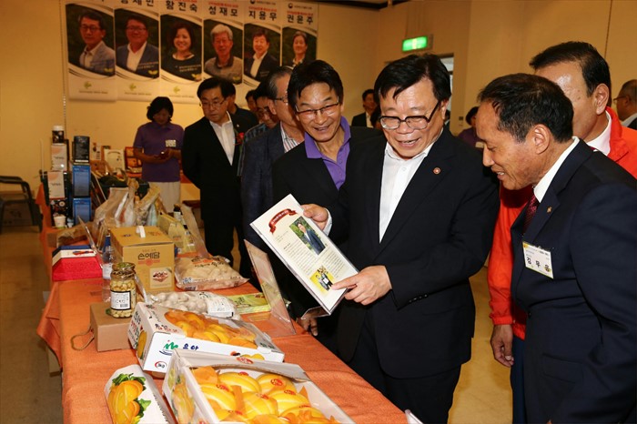 (옥천=포커스뉴스) 이동필 농림축산식품부 장관이 22일 충북 옥천군에서 개최된 '신지식농업인대회'에 참석해 신지식인이 생산한 농산물을 둘러보고 있다. <사진제공=농림축산식품부>