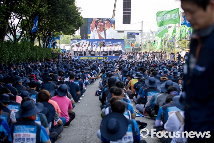 (서울=포커스뉴스) 정부의 일방적인 조선업 구조조정 중단과 현대차 그룹의 성실한 그룹사 공동교섭 참여, 정부의 노동개악 철회등을 내걸며 파업에 들어간 전국금속노조가 22일 오후 서울 서초구 현대자동차 본사 앞에서 금속노조 총파업 대회를 열고 있다.