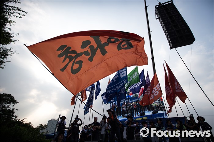 (서울=포커스뉴스) 정부의 일방적인 조선업 구조조정 중단과 현대차 그룹의 성실한 그룹사 공동교섭 참여, 정부의 노동개악 철회등을 내걸며 파업에 들어간 전국금속노조가 22일 오후 서울 서초구 현대자동차 본사 앞에서 금속노조 총파업 대회를 열고 있다.