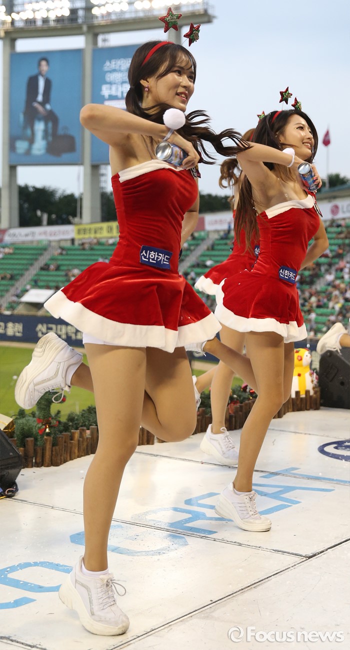 (서울=포커스뉴스) 22일 서울 잠실구장에서 열린 2016 프로야구 두산-LG 경기에서 LG 치어리더가 '섬머 크리스마스' 주제에 맞춰 산타 복장으로 눈스프레이를 뿌리며 한 여름의 더위를 식혀주고 있다.