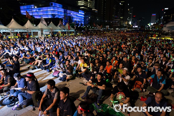 (서울=포커스뉴스) 22일 오후 서울 광화문광장에서 열린 2016 재벌개혁 시민한마당에서 전국금속노동조합(금속노조)이 율동공연을 보며 야광봉을 흔들고 있다.