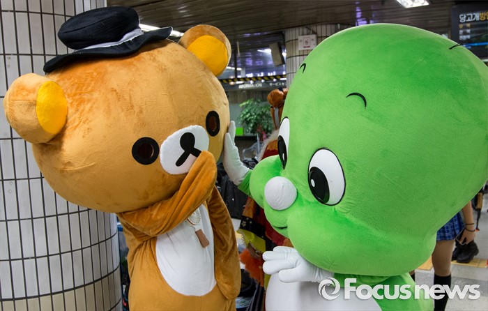 (서울=포커스뉴스) 23일 오전 서울 도봉구 쌍문역에서 둘리(오른쪽)가 리락쿠마와 인사하고 있다, 이날 쌍문동 둘리뮤지엄에서는 개관 1주년을 맞아'둘리네 집들이' 가 열렸다.