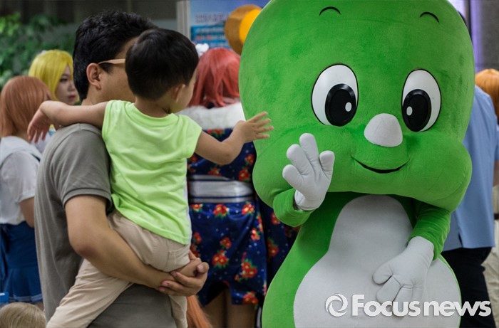 (서울=포커스뉴스) 23일 오전 서울 도봉구 쌍문역에서 한 어린이가 둘리와 인사하고 있다, 이날 쌍문동 둘리뮤지엄에서는 개관 1주년을 맞아'둘리네 집들이' 가 열렸다.