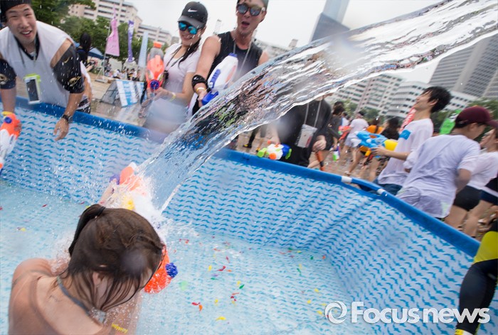(서울=포커스뉴스) 23일 오후 서울 여의도 한강공원에서 열린 한강 물싸움 축제에서 참가자들이 시원한 물총싸움을 하며 더위를 식히고 있다.