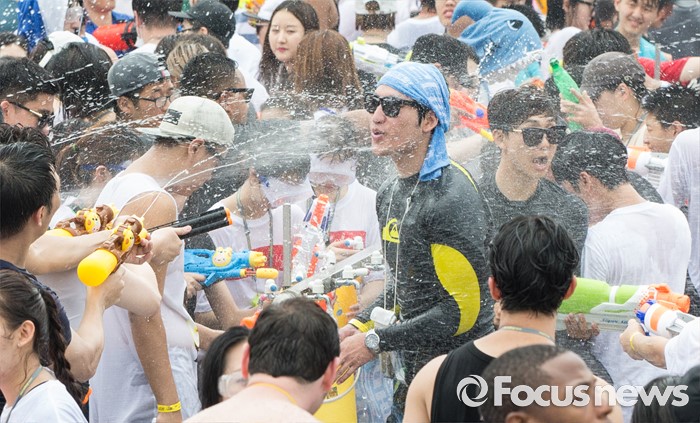 (서울=포커스뉴스) 23일 오후 서울 여의도 한강공원에서 열린 한강 물싸움 축제에서 참가자들이 시원한 물총싸움을 하며 더위를 식히고 있다.