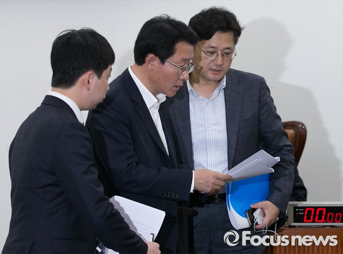 가습기 특위는 25일부터 3일간 환경부 등 주요부처를 방문해 현장조사를 진행한다.서울 여의도 국회에서 가습기살균제 사고 진상규명과 피해구제 및 재발방지 대책마련을 위한 국정조사특별위원회 전체회의를 마친 김상훈(가운데) 새누리당 간사와 홍익표(오른쪽) 더불어민주당 간사가 대화하고 있다. 2016.07.06 박동욱 기자