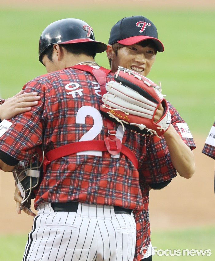 | △ LG 포수 유강남과 포옹하는 장우혁 |