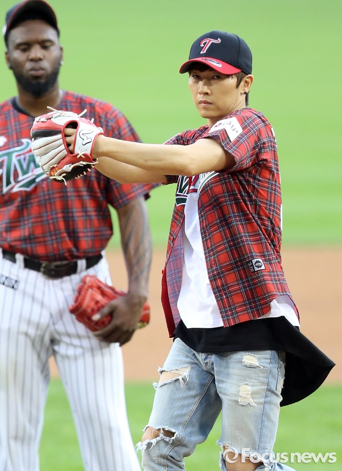 (서울=포커스뉴스) 24일 서울 잠실구장에서 열린 2016 프로야구 두산-LG 경기에 앞서 시구자롤 나온 가수 장우혁이 포수를 보며 와인드업을 하고 있다.