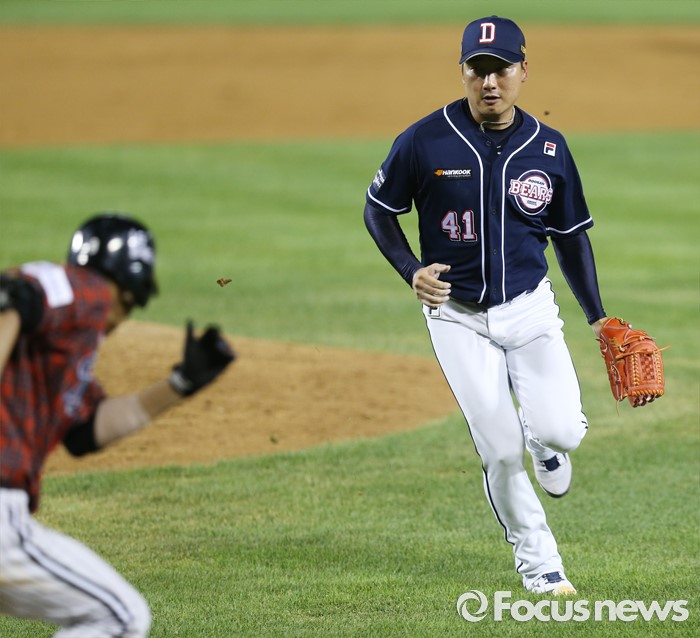 (서울=포커스뉴스) 24일 서울 잠실구장에서 열린 2016 프로야구 두산-LG 경기 8회말 두산 투수 정재훈이 LG 김용의의 기습번트 타구를 쫓고 있다.